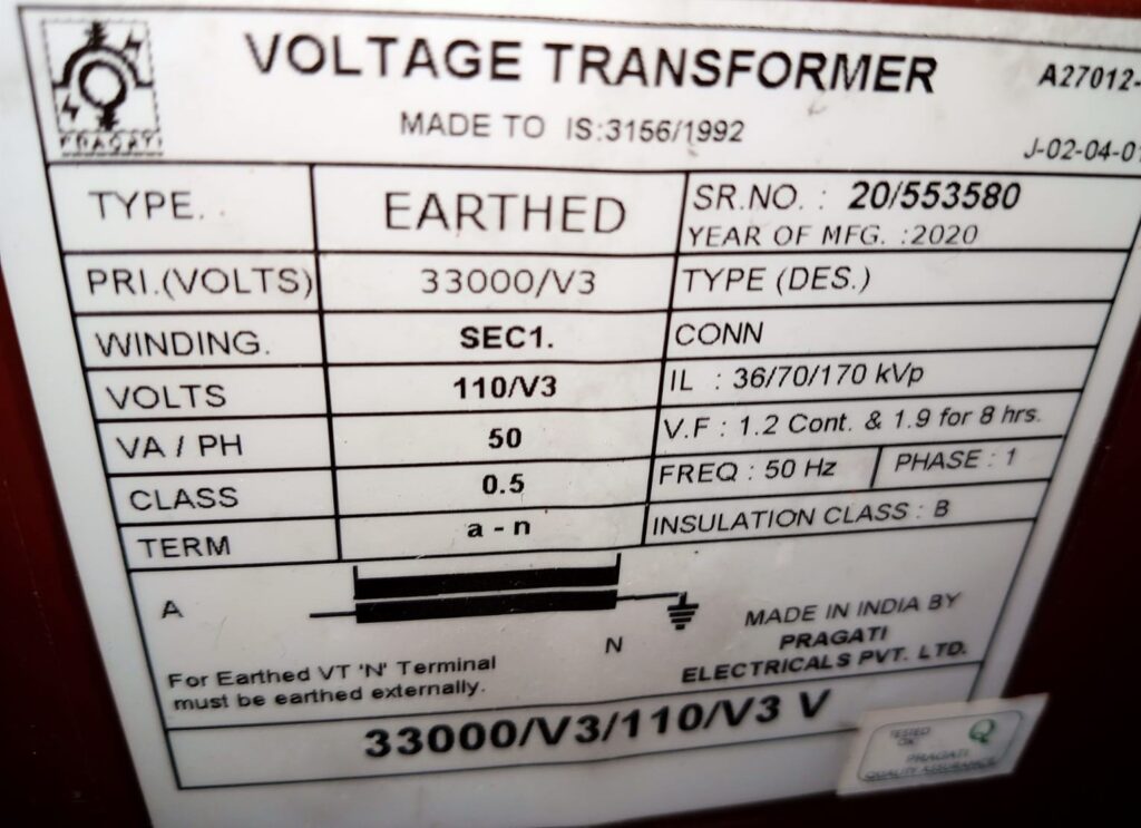 This means the transformer converts the medium voltage level of 33kV into a standard measurable voltage of 110V for instruments and relays. - Type – Earthed Voltage Transformer